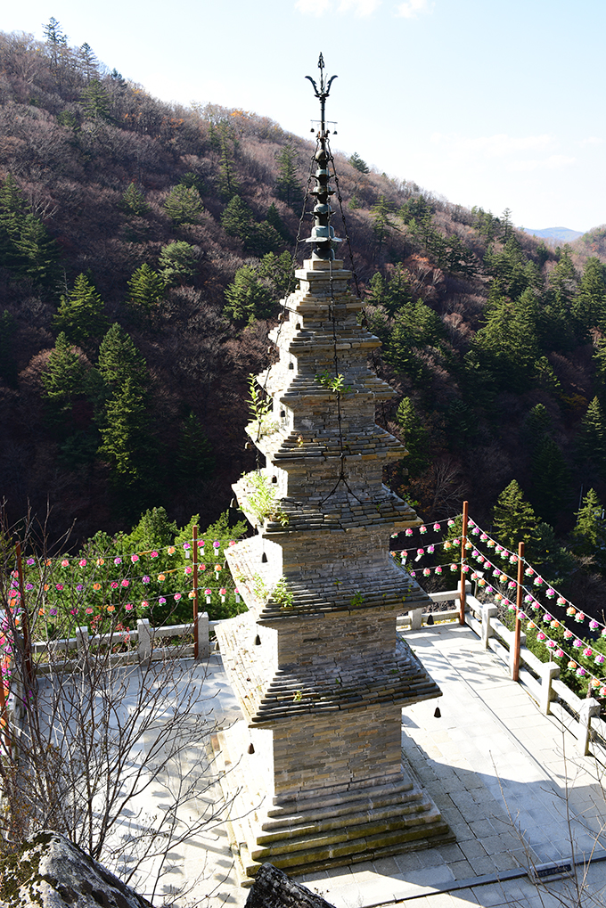 국보332호; 정암사 경내에서 약 100미터쯤 위에 떨어진 적멸궁 뒤편, 산비탈에 벽돌 모양으로 돌을 깎아 만든 7층 모전석탑 형식의 부처님 진신사리 탑으로, 정암사의 상징이며, 자장율사가 당나라에서 돌아올 때 서해 용왕이 보내준 마노석(瑪瑙石)이라는 보석 같은 돌을 가지고 와서 쌓았다고 전해집니다. 옥개 우각 추녀 밑의 상향은 고려시대의 양식이고, 청동제 상륜의 투각수법, 탑 앞에 놓인 배례석에 새겨진 연화문이나 안상문 등 고려시대의 특징을 보입니다. 해체수리과정에서 3층 옥신부터 기단부까지의 사이에서 5개의 탑지석이 발견되고, 기단부 최하단석 밑의 적심부에서 청동합, 은제외합, 금제외합 등의 사리장엄구가 발견되어 조선시대 말기까지 여러번 보수가 있었음을 알 수 있으며, 지금까지 알려진 탑지석에 의하면, 이 탑의 현재 모습은 1653년의 중건 때 갖추어진 것입니다.