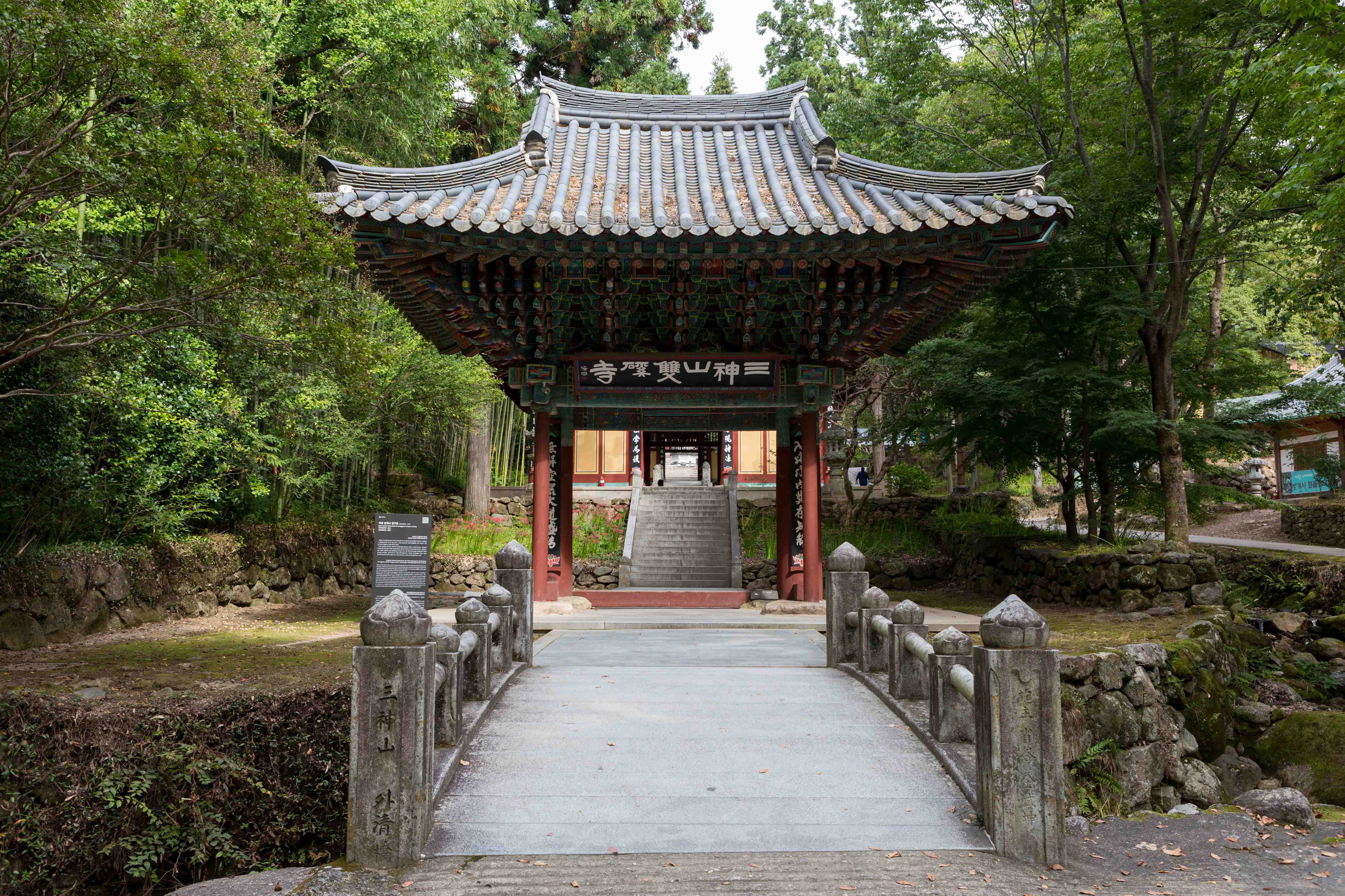 | 일주문 | 사방1칸 다포계 겹처마 팔작지붕; 경남유형문화재86호; 사찰의 첫 번째 삼문으로, 속세와 불국토의 경계를 상징하며 일심으로 진리의 셰계로 나아가가는 의미를 담고 있습니다. 보통 일주문과 다르게 기둥 앞뒤에 보조 기둥을 세우고 팔작지붕을 올렸으며, 현판 '三神山雙磎寺(삼신산 쌍계사)'은 명필 해강 김규진의 친필입니다. |