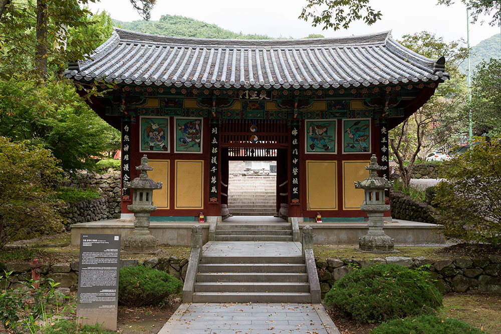 | 천왕문 | 앞3칸·옆2칸 맞배지붕; 경남유형문화재126호; 삼문 준 세 번째 문으로, 불법·가람을 수호하고 수도승· 불자를 돕는 목조 사천왕상(경남유형문화재413호)이 봉안되어 있습니다. 사천왕은 불교세계의 중심인 수미산 중턱에 살며 권속들과 함께 동서남북을 지키는 신입니다. [지국천왕(持國天王): 동쪽 황금타(黃金埵) 천궁에 사는 안민(安民)의 신. 청색얼굴에 손에 비파, 휘하에 음악의 신 건달바] [광목천왕(廣目天王): 서쪽 백은타(白銀埵)에 살며 죄인에게 벌·고통을 주어 불심을 일으키는 신. 붉은관·갑옷에 손엔 용과 여의주, 권속으로 용과 비사사] [증장천왕(增長天王): 남쪽 유리타(瑠璃埵)에 사는 덕을 베푸는 신. 적육색 몸에 노한 눈, 갑옷에 손에 긴 검, 부하에 구반다] [다문천왕(多聞天王)/비사문천왕: 수정타(水精埵)에 살며, 부처님의 설법을 듣는 신. 손에 탑· 삼지창, 권속으로 야차·나찰] |