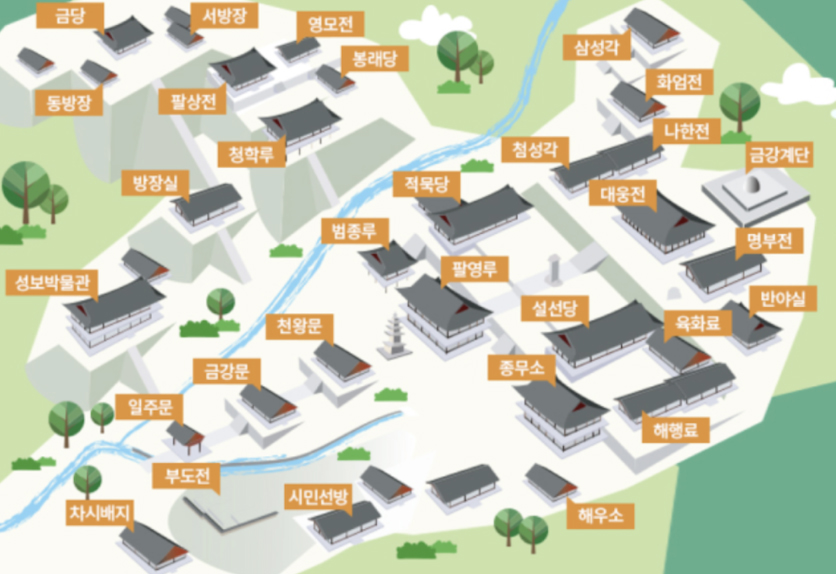 | 가람 배치 | 금당 영역: 청학루·봉래당·영모전·팔상전·서방장·동방장·금당; 영주당·보래당·동서 방장 등은 한라산·금강산·지리산의 다른 이름인데, 이는 곧 삼신산을 상징하는 것으로 영산숭배사상을 반영합니다. 대웅전 신행 영역(쌍계의 한 계곡 건너편):일주문·금강문·천왕문·팔영루·설선당·적묵당·대웅전·나한전·명부전·삼성각·화엄전 문화예술관 포교영역: 대불 ·문화예술관(템플스테이 +) |