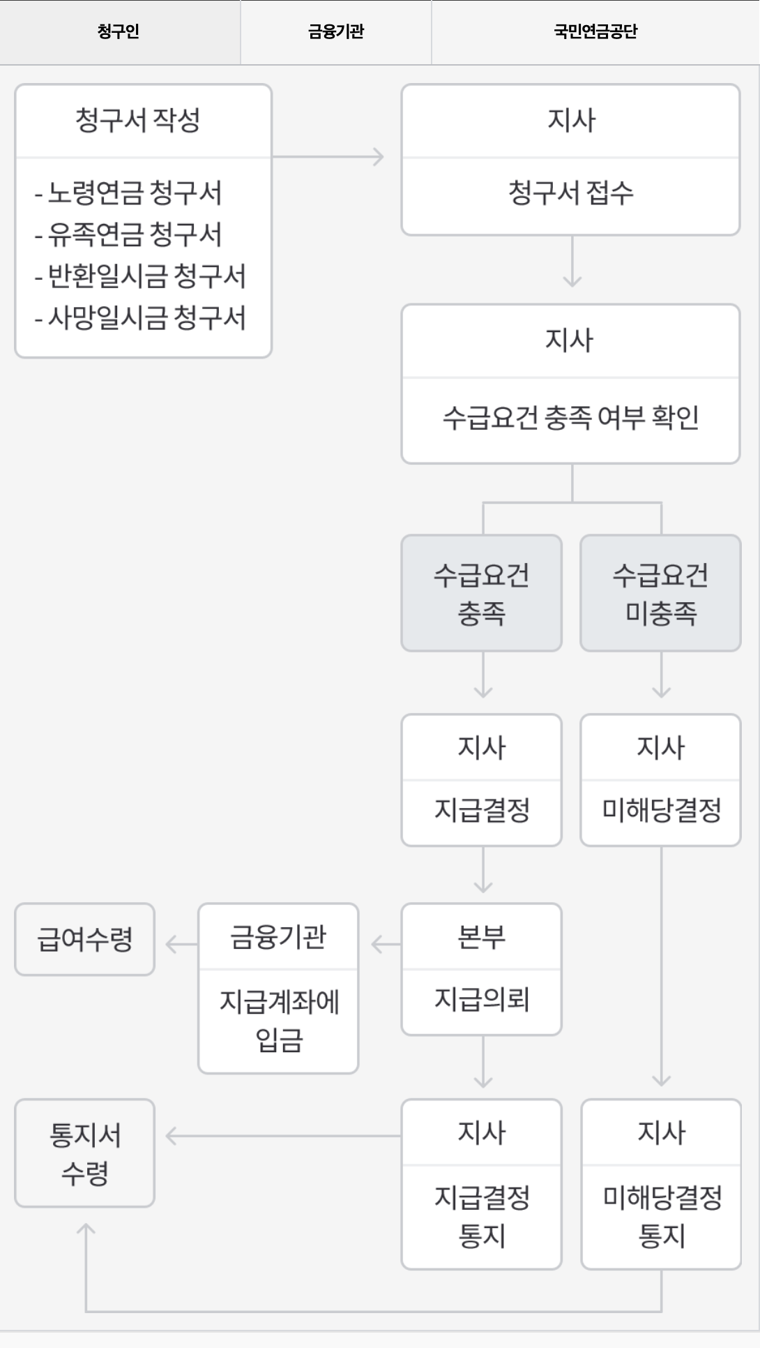 -청구인이 노령연금, 장애연금, 유족연금, 반환일시금, 사망일시금의 해당 급여청구서를 공단 지사에 제출하면, 공단 지사에서는 수급요건을 충족하는지를 확인한 후, 수급요건을 충족하는 경우에는 지급결정을 하여 급여(연금, 일시금)를 지급하며, 수급요건을 충족하지 못하는 경우에는 수급권 미해당결정을 하게 됩니다.
