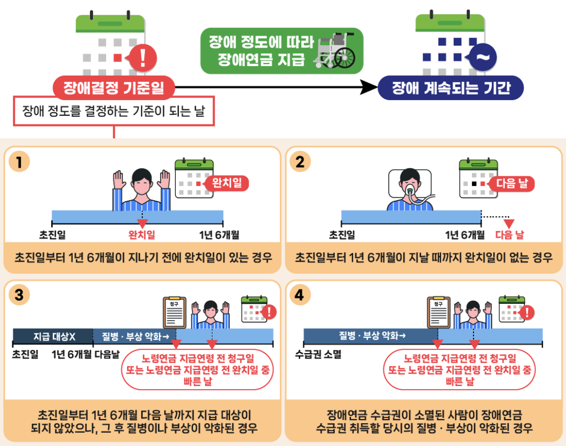 -만약, 초진일로부터 1년 6개월이 되는 날 다음 날 장애등급에 해당하지 않았으나, 노령연금지급연령이 되기 전에 장애등급에 해당되면 청구한 날과 완치된 날 중 빠른 날을 기준으로 장애등급을 결정합니다. (60세 이후 청구한 경우는 60세 전 완치일이 있는 경우에만 장애연금 지급 가능합니다.)