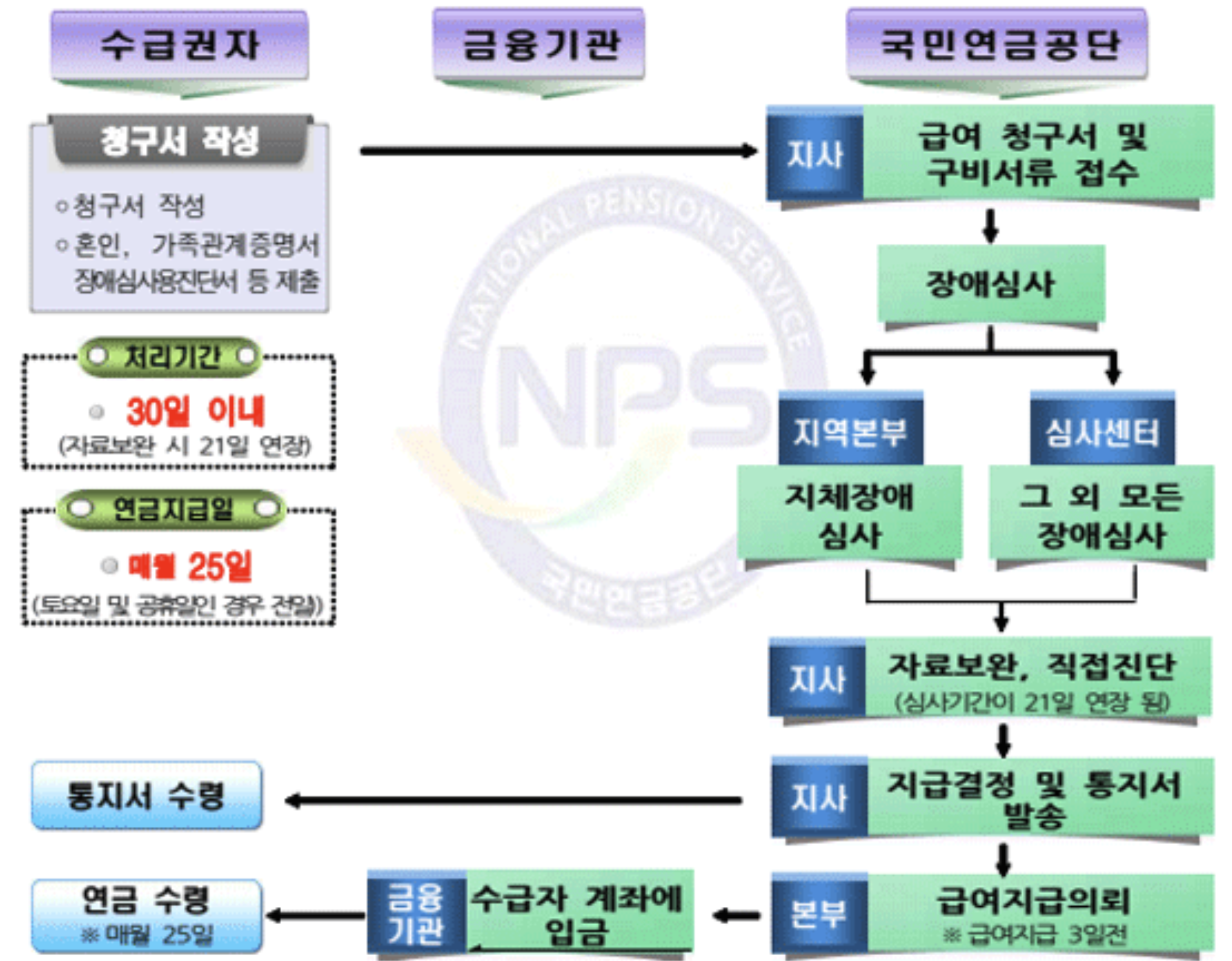 -장애연금 지급청구서 처리절차 중 수급요건(초진일 요건/연금보험료 납부요건 등) 충족 여부를 확인하는 과정에 '장애심사'라는 절차가 있습니다. 특별한 사정이 없 한 21일(공휴일 제외) 이내에 하게 되며, 장애심사센터로 심사의뢰를 하게 됩니다.