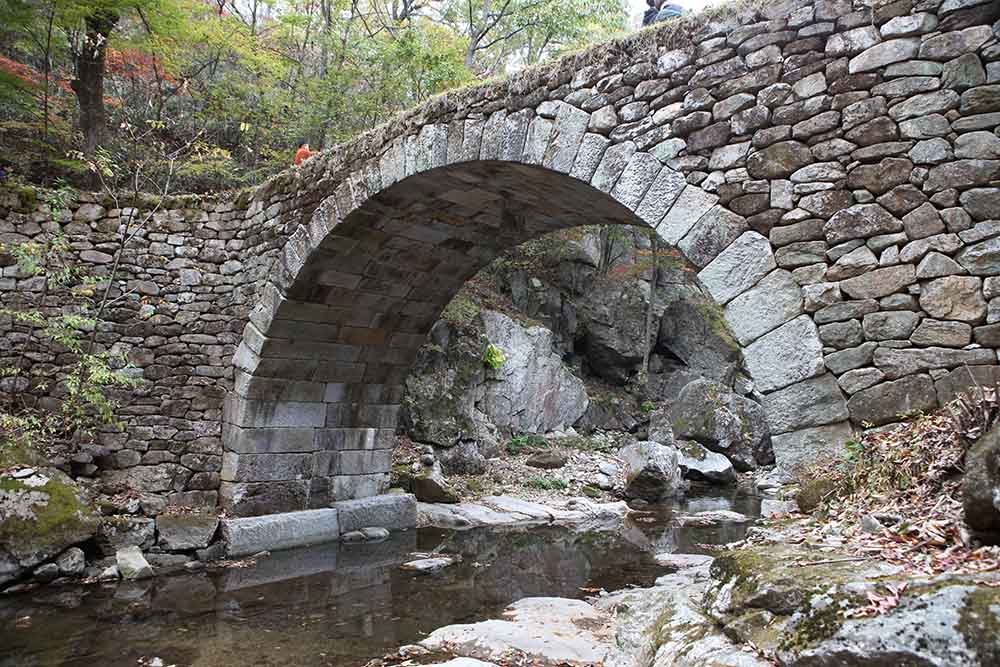 보물400호; 화강암으로 만든 길이 14 m, 폭 4 m의 반원형 홍예다리로, 계곡을 건너며 불국토로 진입함을 상징합니다. ‘신선이 하늘로 올라가는 다리'라는 뜻을 지닌 신화 속 무지개 다리이며, 승선교와 그 아래 무지개로 품은 강선루의 정경은 절승이 따로 없어 보입니다. |