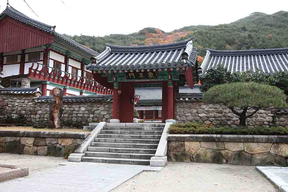 앞3칸·옆3칸 다포계 겹처마 맞배지붕; 동서남북 하늘을 지키는 사천왕을 모시는 삼문으로, 금강문이 없을 땐 금강역사를 모시고 사찰을 수호하는 대문역할을 합니다. 앞문을 들어서면 우측에 비파를 든 지국천왕과 칼을 든 증장천왕, 좌측에는 여의주와 용을 든 광목천왕과 창을 쥐고 있는 다문천왕이 있습니다. [사천왕: 고대 인도 종교에서 숭상했던 귀신들의 왕이었으나 불교에 귀의하여 부처님과 불법을 지키는 수호신이 되어, 수미산(須彌山) 중턱에서 그들의 권속들과 동서남북을 지키며, 매월 8일에는 사천왕의 사자(使者)들이, 14일 태자(太子)가, 15일 사천왕 자신이 제석천(帝釋天)에게 보고함] [동방지국천왕(持國天王): 안민(安民)의 신으로서 수미산 동쪽 중턱의 황금타(黃金埵)에 있는 천궁에서 살며, 팔부신중(八部神衆)의 하나로서 술과 고기를 안먹고 향기만 맡는 음악의 신 건달바(乾達婆)를 거느림] [서방광목천왕(廣目天王): 여러색으로 장식된 몸, 크게 뜬 눈, 그리고 크게 벌린 입을 하고, 수미산 중턱 백은타(白銀埵)에 살며, 잡어(雜語) · 비호보(非好報) · 악안(惡眼)이라고도 불리며, 용(龍)과 비사사(毘舍闍)를 거느림] [남방증장천왕(增長天王): 만물이 태어날 수 있는 덕을 베풀겠다는 서원을 세우고, 수미산 남쪽의 유리타(瑠璃埵)에 살며, 구반다 등 무수한 귀신을 거느림] [북방다문천왕(多聞天王): 비사문천왕(毘沙門天王); 수미산의 북쪽 수정타(水精埵)에 살며, 항상 부처님의 도량을 지키며 부처님의 설법을 듣는다 하여 다문이라 불리는 천왕으로, 한때 불법에 귀의하여 광명신(光明神)이 되었으나, 본래 자신의 원을 지킨다 하여 금비라신(金毘羅神)이라고 불리며, 그의 권속으로 야차와 나찰을 거느림] |