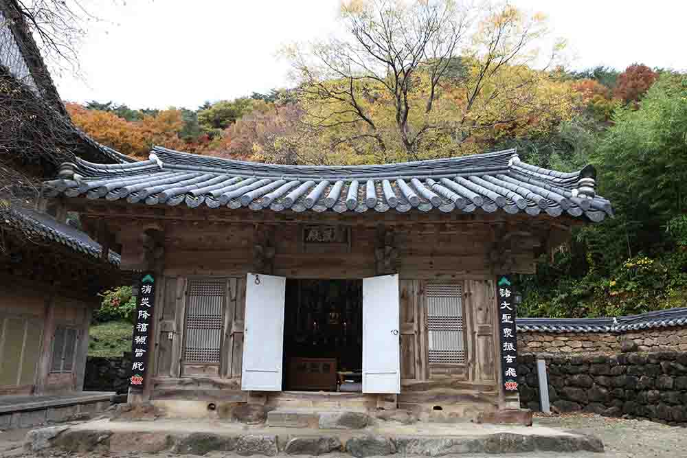 앞3칸·옆2칸 이익공 겹처마 맞배지붕; 각황전 북쪽에 위치한 전각으로, 응진전이라고도 하며, 내부에 우물마루, 그리고 전면 외 3면에 불단을 두었고, 내부 중앙 수미좌(연화좌)에는 석가여래좌상과 좌우 아난상·가섭상, 아미타불 후불도, 후불도 양쪽 3폭씩인 16나한도, 석야여래상 옆 16(좌우 각각 8명)아라한· 사자상·인왕상의 존상이 벽면을 따라 봉안되어 있습니다. 이런 구성은 석가여래· 제화갈라보살·미륵보살로 구성된 수기삼존상과 16나한상을 배치하는 조선 후기 일반적인 나한전 또는 응진전과는 차이를 보입니다. |
