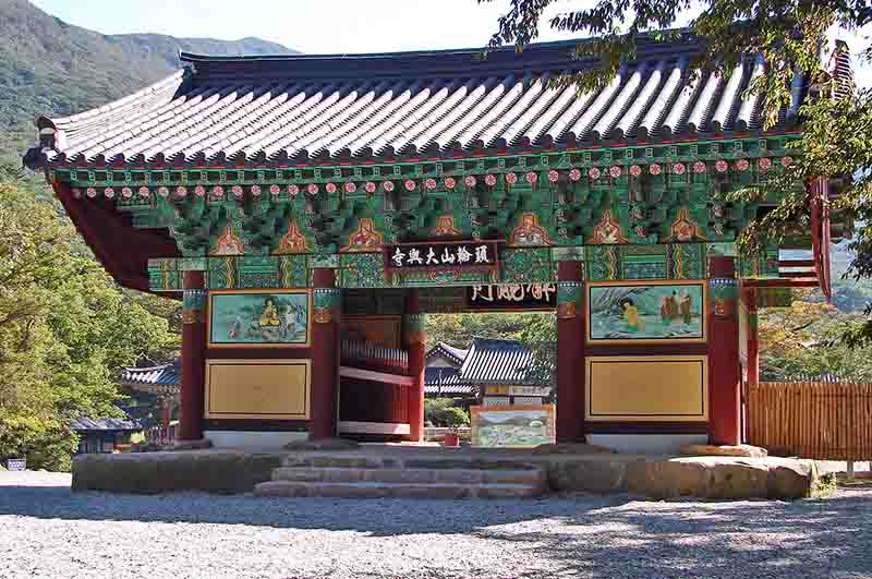 앞3칸·옆2칸 겹처마 맞배지붕; 일반적인 사천왕문 대신 설치된 문루로, 속세를 벗어나 해탈 세계로 들어가는 상징적 출입문이며, 사자를 탄, 반야지혜의 상징 문수보살과, 코끼리를 탄, 실천의 상징 보현보살이 세워져 있고, 인왕도가 함께 봉안되어 있습니다. 어칸에는 해사(海士) 김성근(金聲根, 1835~1919)이 쓴 ‘두륜산대흥사(頭輪山大興寺)’라는 편액과 ‘해탈문(解脫門)’이라는 두 기의 편액이 걸려 있으며, 사천왕상이 없는 이유는 북으로는 영암 월출산, 남으로는 송지 달마산, 동으로는 장흥 천관산, 서로는 화산 선은산이 대흥사를 감싸고 있어 풍수적으로 완벽한 형국을 취하고 있기 때문이라고 합니다. |