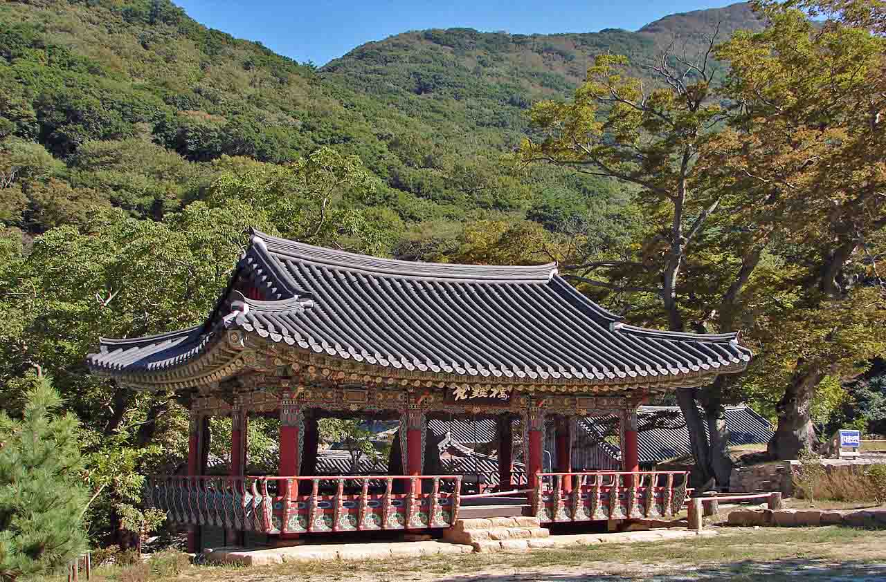 앞5칸·옆3칸 주심포 겹처마 맞배지붕; 금당천(金塘川)을 건너 북원으로 가는 심진교(尋眞橋) 앞에 위치한 2층 누각으로, 누 아래를 통해 나가면(누하진입) 대웅전이 나오는, 북원의 출입문 역할을 하며, 법고·범종·목어·운판 등 의식용 불전사물을 봉안하고 있습니다. 앞면에 침계루(枕溪樓)편액과 후면에는 원종대가람(圓宗大伽藍)이라는 편액이 걸려 있는데, 모두 원교 이광사의 친필이라고 합니다. |