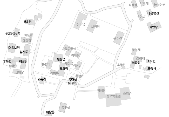 | 가람 3구역 | 북원: 대웅보전 구역: 명부전, 응진전, 산신각, 청운당, 대향각, 침계루, 백설당, 선열당 등 남원: 천불전 구역: 용화당, 봉향각, 가허루, 범종각, 동다실, 무명각, 정진당, 세심당, 적묵당, 일로향실, 만월당, 심검당, 보현전, 문수전 등. 별원: 남원 뒤쪽 서산대사의 사당인 표충사 구역과 동국선원내에 대광명전 구역 |