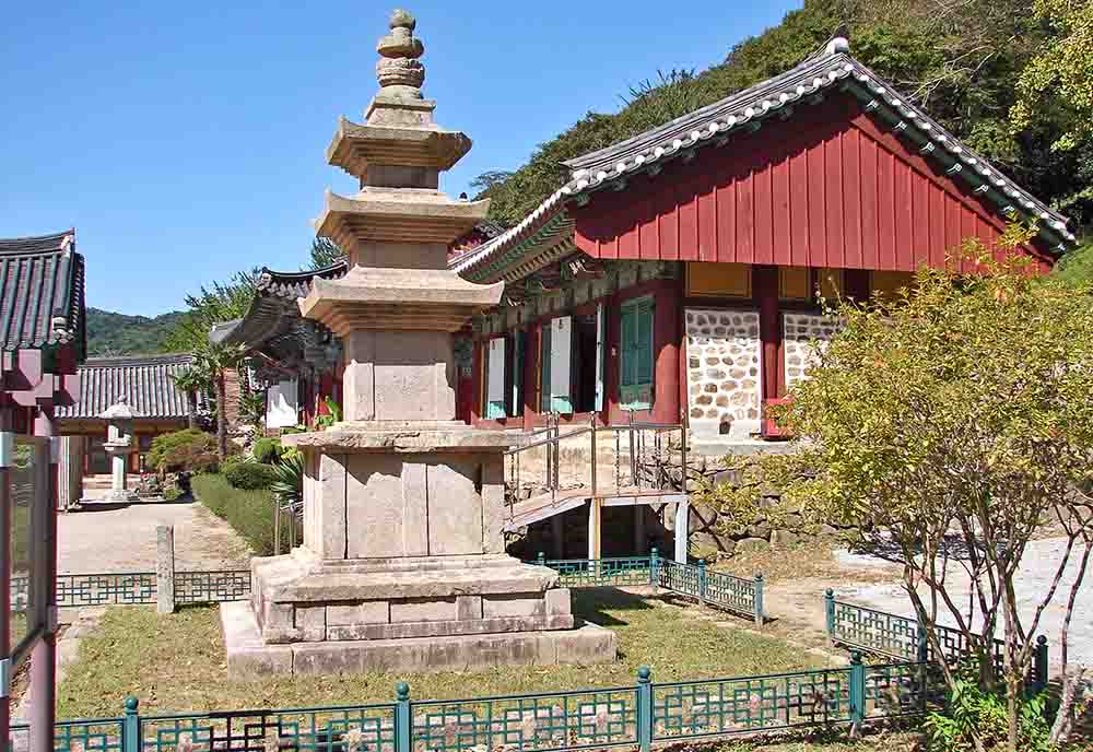 앞5칸·옆3칸 주심포 맞배지붕; 대웅보전 동쪽에 위치하며, 응진당· 산신각을 한 채에 모신 건물로, 응진당·산신각이 각각 3칸과2칸으로 나누어지며, 내부의 특징으로는 우물마루· 연등천장· 천장 상부의 청룡과 황룡도 아래 불단을 설치되어 있습니다. 나한전이라고도 하는 응진당은 목조석가삼존상과 석가모니의 제자 16나한· 판관· 사자· 인왕을 권속으로 모시고, 석가모니 후불탱· 16나한탱· 사자탱을 봉안하고 있으며, 불단 상부에는 관음과 세지의 보살패를 두고 있습니다. 산신각은 연등천장 상부에 황룡과 청룡도를 단청하고, 불단 위에 1901년 조성된 산신도와 독성도을 봉안하고 있습니다. 전각 앞에의 3층석탑(보물320호)은 통일신라 시대 석탑으로, 자연석을 기단으로 삼고 2층 기단 위에 3층 탑신부를 올린 일반적 석탑 양식입니다. |