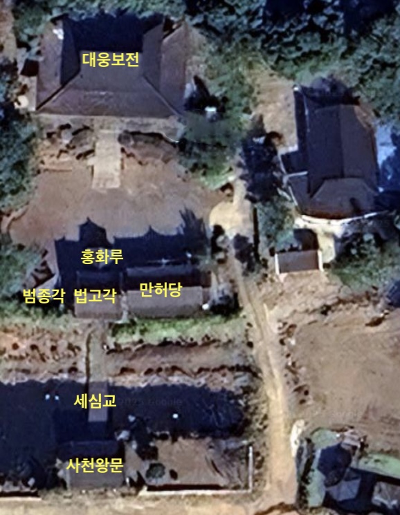 법고각 앞2칸·옆2칸 맞배지붕; 홍화루에 바로 옆에 위치한 전각으로, 세심교를 지나 대웅보전 앞마당으로 오르는 계단 바로 위에 보이는 건축물입니다. 불전사물 법고가 달려있으며, 앞에서 보면 2층 계단을 오른 후 뒤에서 보면 1층입니다.