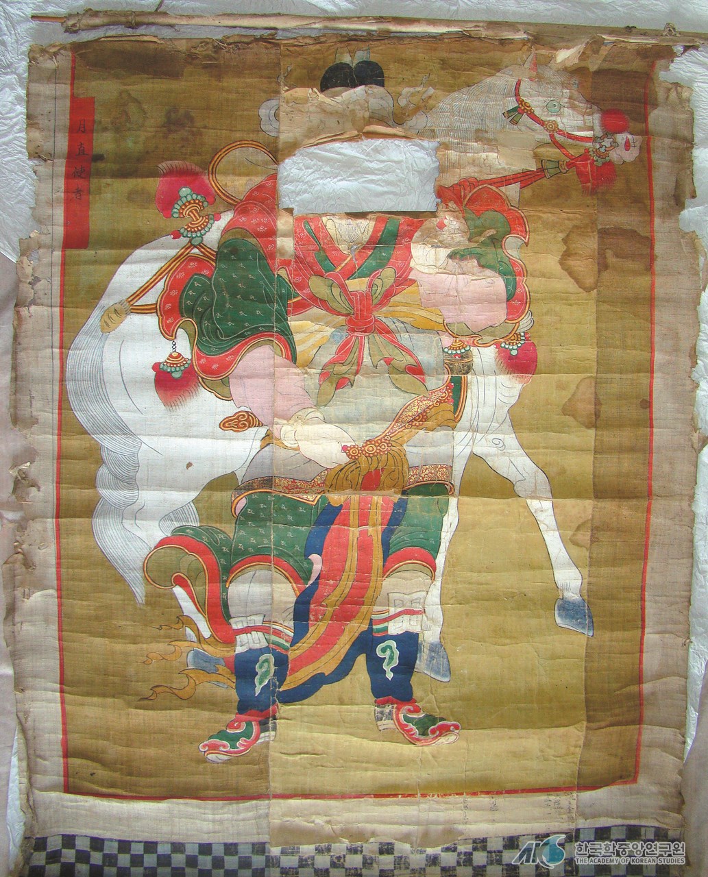 | 제석·범도 및 팔금강·사위보살도帝釋·梵天圖및八金剛·四位菩薩圖 | 보물1766호; 제석천도(1점), 범천도(1점), 사보살도(4점), 팔금강도(8점)로 구성되어 있는 도량장엄용 의식불화입니다. 1772년에 제작되었으며, 괘불도와 도량옹호번이 함께 남아 있는 드문 사례로, 야외 의식불화 연구에 귀중한 자료가 됩니다. [제석천: 불교의 수호신이자 하늘의 왕. 세계의 중심인 수미산 맨 위 '도리천'의 주인이며, 불법을 옹호하고 부처님을 지킴] [범천: 음욕을 벗어난 존재들이 머무는 색계(色界)의 첫 번째 하늘인 초선천에 거주하는 천신] [금강역사: 불교의 수호신. 금강저(金剛杵)를 든 신이라는 뜻으로, 사찰의 문 양쪽에서 악귀가 들어오지 못하게 지키는 수문장 역할] |