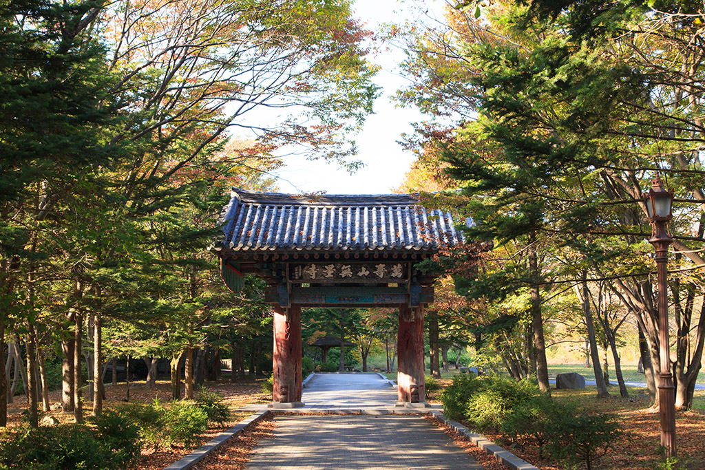 앞1칸 맞배지붕; 사찰에 들어설 때 가장 먼저 만나는 문으로, 세속의 번뇌로부터 마음을 하나로 모아 진리의 세계로 들어가는 '일심(一心)'을 상징합니다. 일주문 앞뒤로 각각 만수산무량사(萬壽山無量寺)과 광명문(光明門)’이라 적힌 편액이 걸려 있는데, 이는 특이한 두인(頭印)으로 알려진 서예가 차우 김찬균(此愚 金瓚均)선생의 친필이라고 합니다. 편액의 오른쪽 상단 귀퉁이에 한반도 문양을 새기고 그 안에 '일체유심조(一切唯心造)'라는 글귀를 작은 글씨로 새겨 넣는 독특한 특징이 있다고 합니다. |