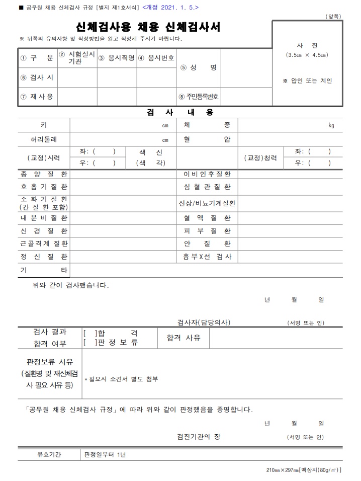 | 공무원채용신체검사서 | 국가공무원(경찰서, 소방서, 우체국, 교도소 등)이나 지방공무원(도/시/군/구청, 교육청, 보건소 등) 지원자 |